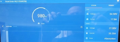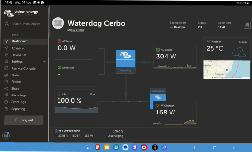 New LiFePo4 batteries were fitted in 2023 and the system was then configured and monitored via the Victron VRM, and displayed by an App on any tablet. We are still connected to mains shore power but use very little when there is sunshine. When the sun sets we run on the batteries and in the morning they charge up again.