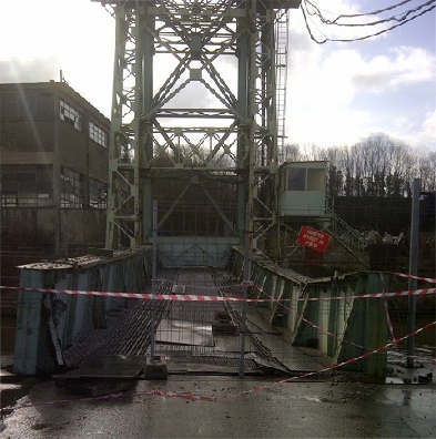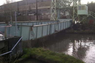 On Thursday 26 March 2015 the Nexans bridge was being opened to allow boat traffic overnight when the supporting arms snapped and the bridge came crashing down. It must have been a terrific shock for the operator, stood in the control box as the counter weight slammed into the tower’s structure