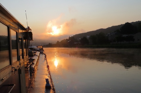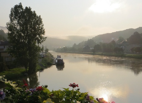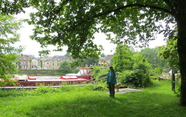 We stopped at a newly built quayside in Montherme and ate a Sunday lunch in the local Franco-Belge restaurant which was really good. On the following Tuesday 25th June we learned that a barge would be leaving the quay at Charleville-Mezieres so a space was available. We quickly took Waterdog to Bogny-sur-Meuse and spent the night at the pontoon there with the plan to leave early in the morning to get to the first lock for 9am when they start operating. We set the alarm for an early breakfast and dog walk.