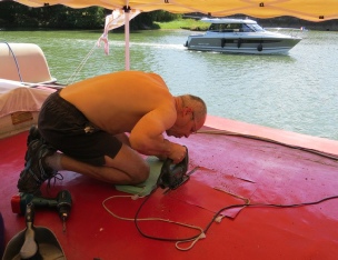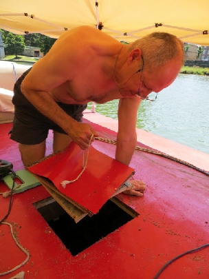 We were glad when our new roof fan arrived as we have a problem on Waterdog getting air to circulate inside during a hot spell. We carefully marked up the roof and set to with drill and jigsaw.