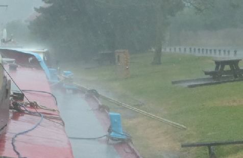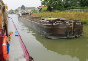 We stopped in Rethel for 2 days to pick up our best friends Pete and Tracy due to arrive from England. Our second day in Rethel brought long hours of thunderstorms and whipping winds lashing into the boats. The side decks filled up to overflowing and we watched in wonder as lightening strike after lightening strike hit all around in rapid succession. Tilly cowered under our wheelhouse table and then there was a flash and a crash simultaneously which had us looking for burn marks on the boat, the shore power blew as well. A Dutch boater told us later that the lightening had hit the water just across the canal from us and that's when the power blew. The surge may have gone from our boat to shore since we found our power lead was also melted at the shore socket and needed replacing when the power was restored. There were a lot of storms around and we were told of a tornado at Dieppe to our northeast which did a lot of damage. We saw plenty of trees blown down into the river as we continued our cruising but nothing that we couldn't go around. Soon after the storms left us it was sunny and hot again so we continued our policy of cooking outside on a camping stove with legs.