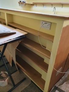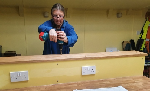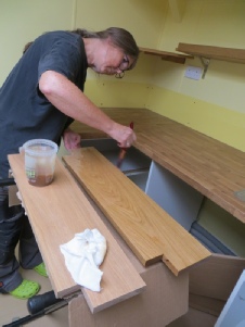 Lawrence made the oak shelves and Lorna sanded and oiled them. The top shelf is screwed down and then plugged with oak plugs drilled from spare off-