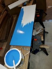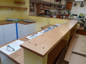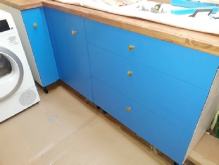 October/November brought Lockdown 2 and no sailing as the dinghy park was out of bounds. We got on with the galley build again. Lorna liked the plain temporary plywood doors that I had made, so we had 18mm thick rectangles cut by a local company so we could finish them to the colour of our choice. So, we decided on a beautiful blue paint and paired it with polished yellow agate handles -