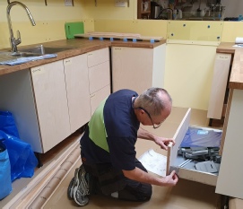 We measured up for the yellow Perspex splash backs to be laser cut by a specialist company and then Lawrence trimmed them using a new fine blade on the cross cut saw. They fitted really well and are sealed to the work top and wall.