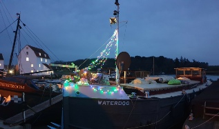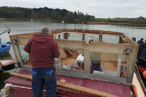 Woodbridge boatyard made a new wheelhouse roof for us in 2021 and fitted it one cold December morning. It was to be insulated, draft proof and strong enough for solar panels. The old roof was 6 panels, easily removed for going under bridges and we are doing that in the UK. It transformed the wheelhouse into a useable room, even at Christmas.