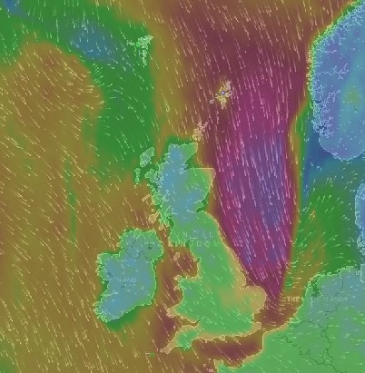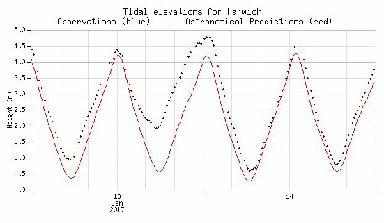 The mesmerizing app (left) called windyty shows animation of the northerly winds that caused the storm surge at 0100 on 14 January 2017. Strong northerly winds coming right down the North Sea pushed water south along the east coast of England. We could check real time tides for various east coast towns as the