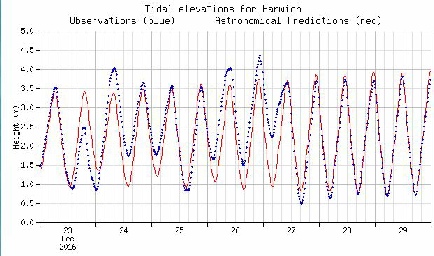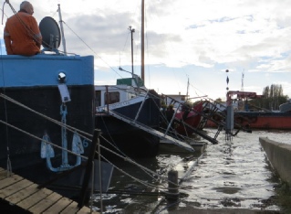 surge progressed down the east coast. The graph on the right shows recorded tides at Harwich in blue dots against the predicted (normal) tide in red. The low tide on 13 January was about 1.5m higher than it should have been so as the tide rose we expected the high tide to be very high indeed. The environmental agency turned up to shut the towns flood gates, with us on the outside of course, and we loosened some ropes and made ready. At midnight on 13 January you can see that the upward surging tide checked for a period and then the high water online reached about 0.7m higher than it should have. We put this down to timing as the storm surge seemed to have arrived before the predicted high water, meaning that the 2 would coincide to give a very high water. It was also down to a last minute change of wind direction from Northerly to North easterly which started blowing the surge off the shore. The Christmas period brought several storm surges which flooded the quay and meant we had to find higher