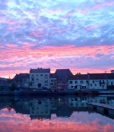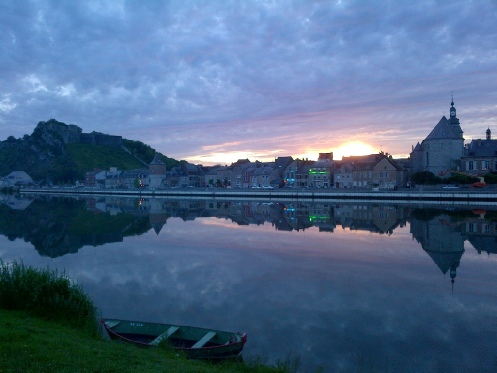 We stopped in Givet for 2 nights on the town quay and took the picture below in the evening of the citadel above the town. If you look closely there is a cat sat in the back of the small boat in the foreground. (Right) Waterdog under and over the sunset in Givet.