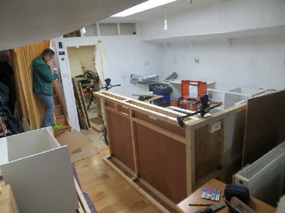We fitted LED lights, painted walls and put sockets in. Then had a carpenter fit the work tops and sink to get invisible joins and nice finish.