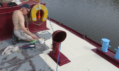 In an attempt to keep the boat cooler in the summer this year we have planned to change the deck and coaming colours to ivory/cream. I started with all the rust spots by chipping, brushing and treating with rust inhibitor. Then we have chosen a new paint called Rustoleum and we mix into it fine granules of non slip rubber grit. It went on beautifully but I soon learned that I needed dark glasses on so I could keep my eyes open when painting.